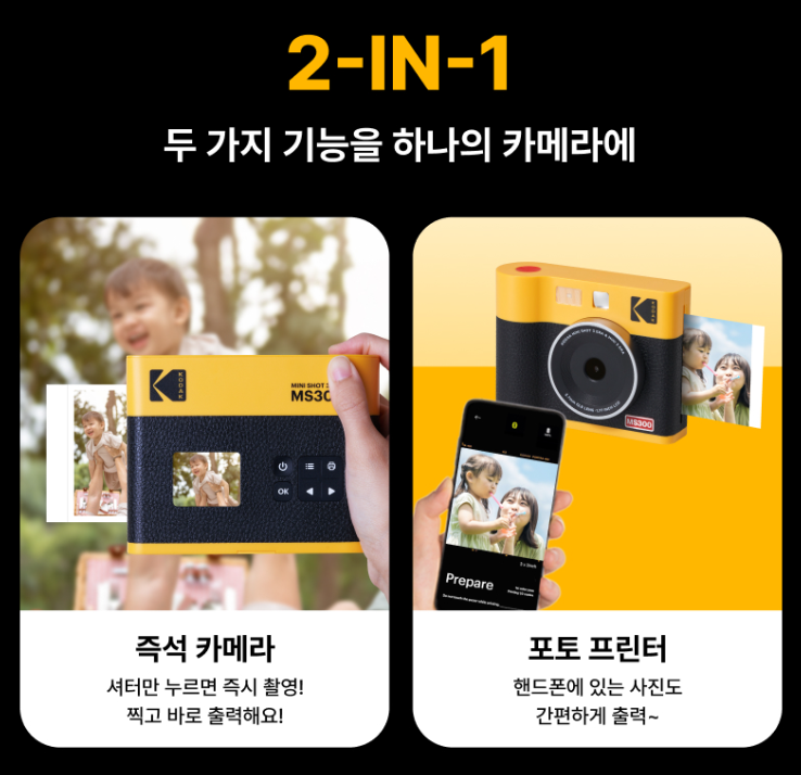 코닥 미니샷(Kodak Mini Shot) 시리즈는 즉석 카메라와 포토프린터 기능을 결합한 제품입니다. 사진을 찍고 바로 인화할 수 있는 것이 가장 큰 특징이죠. 또한 스마트폰과 블루투스 연결을 통해 휴대폰에 저장된 사진도 인화할 수 있어 디지털과 아날로그의 감성을 동시에 즐길 수 있는 매력적인 제품입니다.